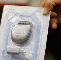 Chefarzt Dr. Stephan Schmidt-Schweda mit dem zweiten in Deutschland implantierten Defibrillator mit Teleanbindung kurz vor der Operation im Ev. Krankenhaus Göttingen-Weende.Als eine der ersten Kliniken in Deutschland hat das Evangelische Krankenhaus Göttingen-Weende einem Patienten mit einer Herzmuskelschwäche einen neuartigen Defibrillator implantiert.