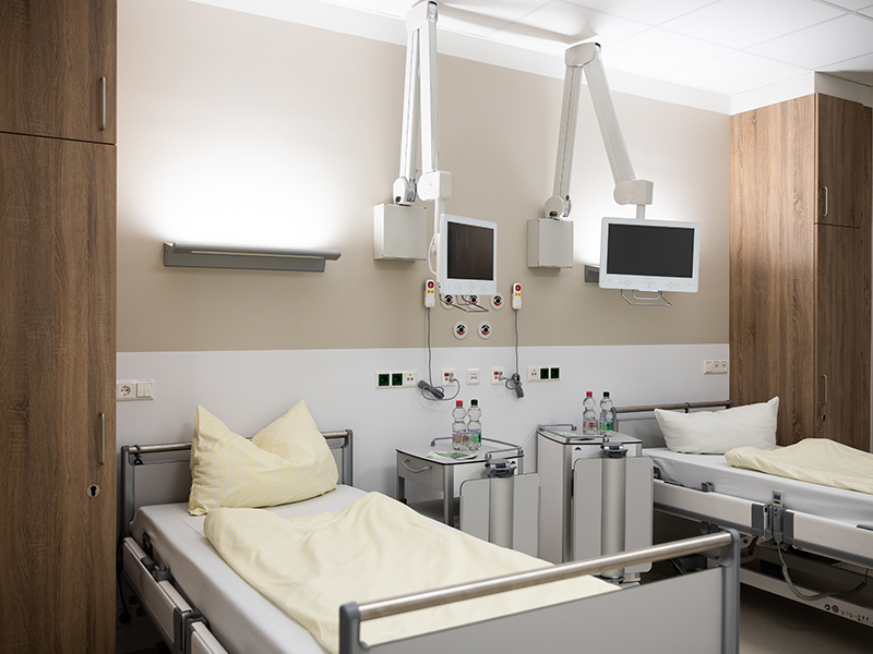 Im zweiten und dritten Obergeschoss befinden sich die zwei großen Bettenstationen für die Pneumologie. Die Stationen haben 55 bzw. 64 Betten, die pneumologische Station 3.2 beinhaltet dabei das Schlaflabor mit sechs Plätzen und eine Isoliereinheit. Auf der Station 3.3 wird unter anderem eine Covid-Einheit etabliert, die über Schleusen abtrennbar ist. Das Besondere: Alle Patienten-Badezimmer im Neubau sind mit einer Fußbodenheizung ausgestattet. „Ich glaube, wir sind damit eines der ersten Krankenhäuser in Deutschland, die die Nasszelle so heizen“, sagt EKW-Bauleiter Herbert Schmidt. Zudem gibt es neben dem normalen Spiegel in jedem Badezimmer einen Ganzkörperspiegel.